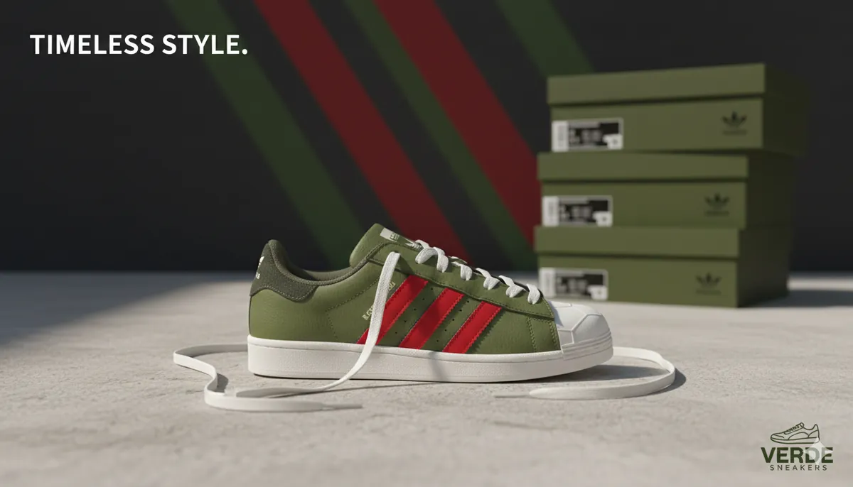 La Superstar s'habille de vert olive et de rouge pour un look urbain et sophistiqué. Un mélange parfait entre héritage classique et audace moderne.